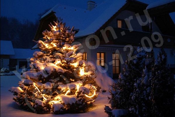 Традиционный и лаконичный вариант декора не теряет своей актуальности. Для иллюминации стоит брать светодиодные гирлянды, разрешенные для использования вне помещения. Они не причинят вреда ветвям, поскольку практически не нагреваются, мало потребляют энергии, компактные и экономичные. Маленькие огоньки поднимут настроение и создатут ореол волшебства и сказки. Особенно выразительно и эффектно они смотрятся снежным вечером – когда разноцветные огоньки отражаются от кристалликов снега, создавая причудливые танцы света и теней.
