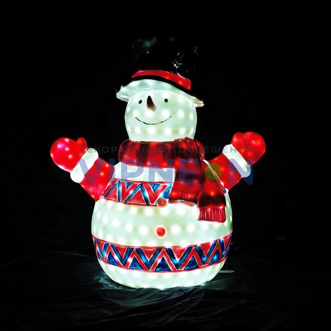Снеговик – один из символов Новогодних торжеств. Объёмные световые акриловые фигуры «Снеговик – лесовик» украсят праздничные мероприятия, проводимые в помещениях или на открытом воздухе. Данная светодиодная техника обладает высокой степенью защиты IP 54, фигуры устойчивы к морозам до – 40 градусов, снегу, пыли и прочим загрязнениям.