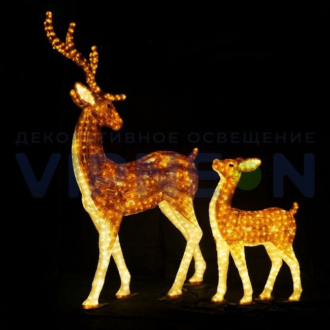 К числу символов Нового года и Рождества относятся полярные олени. Эффектным декоративным украшением торжеств послужат акриловые фигурки оленей, оснащённые светодиодной подсветкой. Световые фигуры акриловые "Пара оленей" представлены двумя устройствами, которые отличаются размерами, мощностью и количеством светодиодов соответственно.